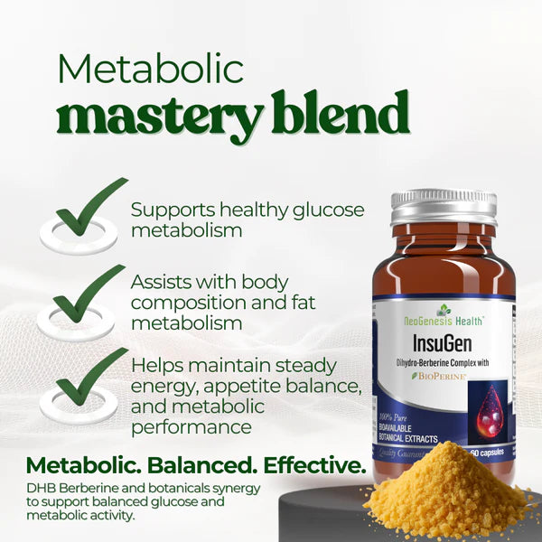 InsuGen is a high-performance glucose and insulin support formula featuring advanced Dihydroberberine a highly bioavailable form of Berberine known for its role in cellular energy regulationandglucose metabolism. It’s combined with synergistic botanicals traditionally used to support metabolic balance, energy stability, and reduced cravings - without stimulants, artificial fillers, or hidden blends